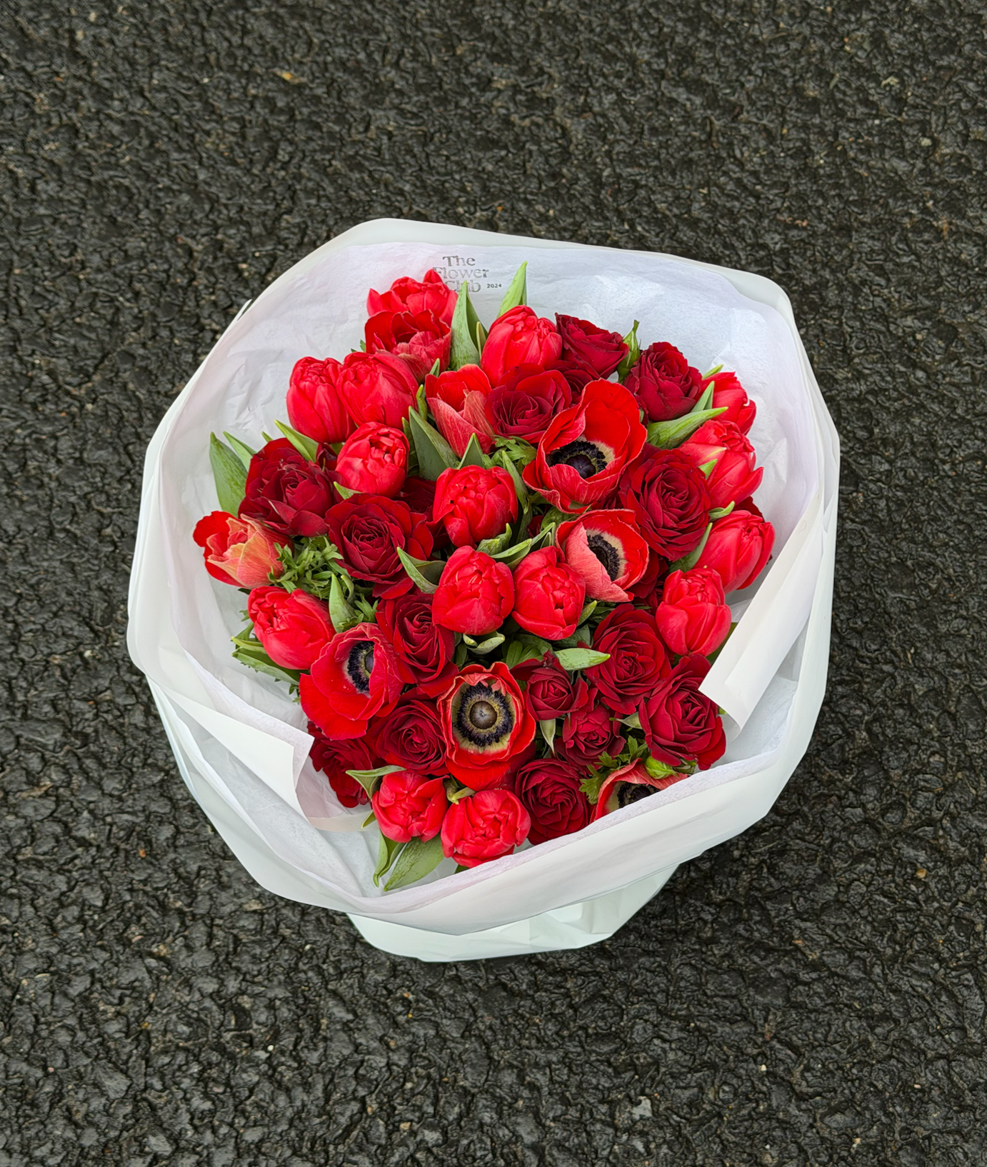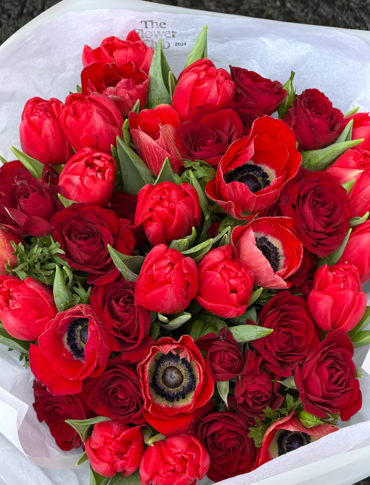 Carefully handcrafted at The Flower Club using premium-grade flowers, this bouquet is perfect for birthdays, anniversaries, thank-you gifts, celebrations, or simply to brighten someone’s day. The mix of structured roses and playful tulips is finished with airy spray roses and statement anemones for depth and texture.
